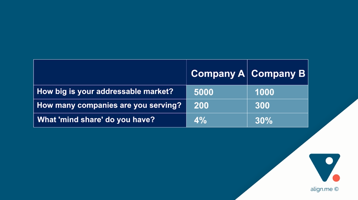 The second example is that same company 12 to 24 months later. They now serve 300 companies, so they’ve grown by 50%—good on them! But along with that growth, they’ve narrowed their current market focus to only 1,000 companies. Those 300 served companies from the smaller market of one thousand means that they are 30% of that market.