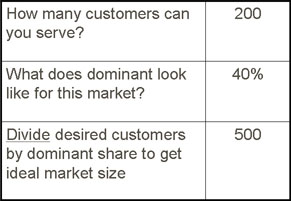 - How small does your market need to be for you to dominate? If the plan described above is for your 200 customers to be 40 per cent of the market, how big is the ideal market in total? To calculate this, divide your target customer base (200) by your target market share (40 per cent) to determine the number of businesses in your ideal market size. In this example, the ideal market has just 500 businesses in the whole market.
